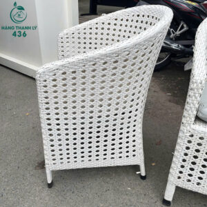 - Mô tả: Ghế mây nhựa cũ màu trắng thiết kế dạng bo tròn lưng ôm nhẹ, tạo cảm giác thoải mái khi ngồi. Chất liệu mây nhựa cao cấp đan thủ công trên khung kim loại chắc chắn, chịu lực tốt, thích hợp cho sân vườn, ban công, quán cafe hoặc spa. Mặt ngồi có đệm bọc da màu xám nhạt, dễ vệ sinh và mang lại sự êm ái khi sử dụng. Màu trắng tinh tế giúp không gian thêm sáng và hiện đại. Hàng còn mới khoảng 90%, bền đẹp, có thể dùng trong nhà hoặc ngoài trời.