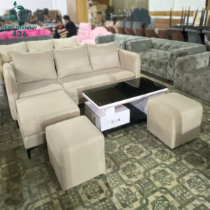 Sofa Góc L Cũ Bọc Vải Màu Kem Dày Dặn Kèm Bàn Mặt Kính Đen