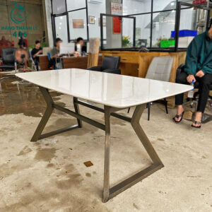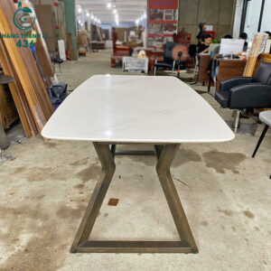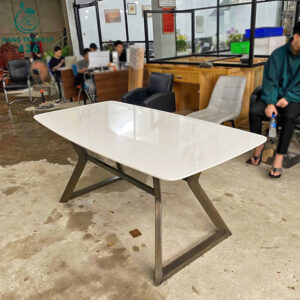 - Mô tả: Bàn ăn cũ mặt đá nhân tạo màu trắng bóng, bề mặt trơn láng dễ vệ sinh. Kiểu dáng hình chữ nhật gọn gàng, phù hợp cho gia đình từ 4 – 6 người hoặc dùng trong nhà hàng, quán ăn. Chân bàn vừa chắc chắn vừa tạo điểm nhấn hiện đại. Bàn có kích thước rộng rãi, đảm bảo không gian dùng bữa thoải mái. Đây là lựa chọn tối ưu cho khách hàng muốn sở hữu bàn ăn đẹp, bền với chi phí tiết kiệm hơn nhiều so với hàng mới.