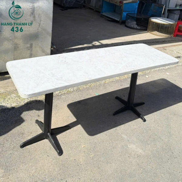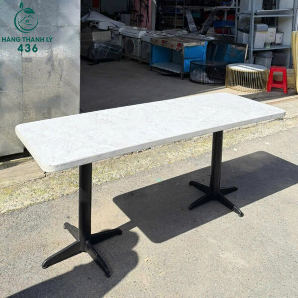 - Mô tả: Bàn đá cũ mặt dài với thiết kế chắc chắn, phù hợp cho quán cafe, quán ăn hoặc sử dụng tại gia đình. Mặt bàn làm từ đá nhân tạo sáng màu, có độ bền cao, chịu lực tốt và chống thấm hiệu quả, dễ dàng vệ sinh chỉ với một thao tác lau chùi đơn giản. Chân bàn dạng trụ kim loại sơn tĩnh điện, kết hợp đế đá vững chãi, giúp giữ thăng bằng tốt ngay cả khi đặt ở ngoài trời. Thiết kế bàn mang phong cách tối giản, dễ dàng phối hợp với nhiều loại ghế gỗ, ghế sắt hoặc ghế nhựa, tạo nên không gian hiện đại.
