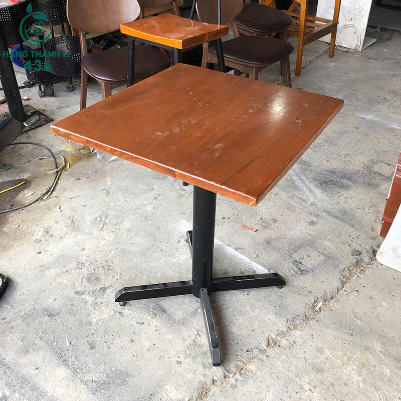 - Mô tả: Bàn cafe cũ với mặt gỗ vuông màu nâu đậm, bề mặt phẳng dễ vệ sinh và mang lại cảm giác sang trọng. Chân bàn dạng trụ sắt sơn tĩnh điện kết hợp đế chân nhánh giúp bàn đứng vững, phù hợp cho không gian quán cafe, nhà hàng hoặc sử dụng tại gia. Kích thước vừa phải, thuận tiện di chuyển và bố trí ở nhiều vị trí khác nhau. Bàn còn chắc chắn, có thể chịu được trọng lượng tốt và sử dụng lâu dài.
