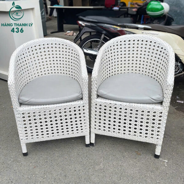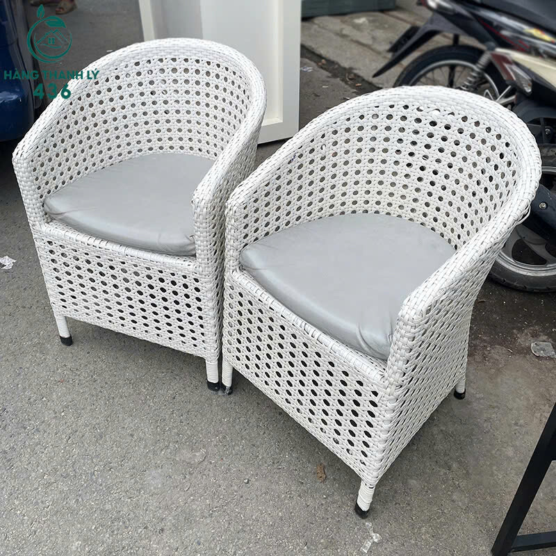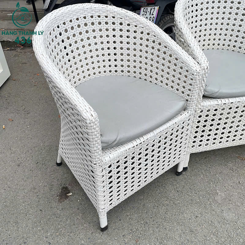 - Mô tả: Ghế mây nhựa cũ màu trắng thiết kế dạng bo tròn lưng ôm nhẹ, tạo cảm giác thoải mái khi ngồi. Chất liệu mây nhựa cao cấp đan thủ công trên khung kim loại chắc chắn, chịu lực tốt, thích hợp cho sân vườn, ban công, quán cafe hoặc spa. Mặt ngồi có đệm bọc da màu xám nhạt, dễ vệ sinh và mang lại sự êm ái khi sử dụng. Màu trắng tinh tế giúp không gian thêm sáng và hiện đại. Hàng còn mới khoảng 90%, bền đẹp, có thể dùng trong nhà hoặc ngoài trời.
