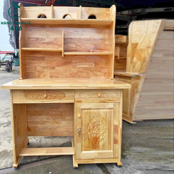 - Mô tả: Bàn học gỗ cao su có kệ sách liền bàn, thiết kế gọn gàng, tiện lợi cho việc học tập, làm việc hay để máy tính. Mặt bàn rộng để thoải mái sách vở và dụng cụ, phía trên gồm các tầng kệ chia ngăn để đồ dùng, sách truyện, hộp bút,… Bên dưới có 2 ngăn kéo và 1 tủ nhỏ, giúp cất đồ gọn gàng. Bàn chắc chắn, có đế lót dưới chân bàn tránh di chuyển, rung lắc.
