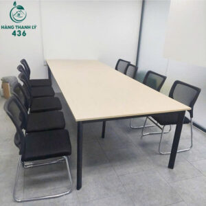 - Mô tả: Chiếc bàn họp này là một giải pháp hoàn hảo cho không gian văn phòng hiện đại, mang đến sự chuyên nghiệp và tiện nghi. Mặt bàn họp được làm từ gỗ công nghiệp phủ vân gỗ sáng màu, không chỉ đẹp mắt mà còn chống trầy xước và dễ dàng vệ sinh. Thiết kế chân sắt màu đen vững chắc đảm bảo độ bền và ổn định khi sử dụng. Đặc biệt, mặt bàn có tích hợp các khe đi dây điện, giúp bạn dễ dàng bố trí các thiết bị điện tử một cách gọn gàng, tạo nên không gian làm việc ngăn nắp và hiệu quả