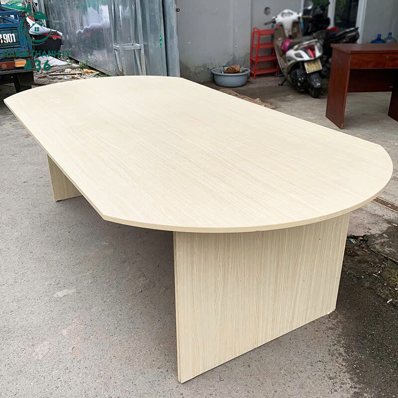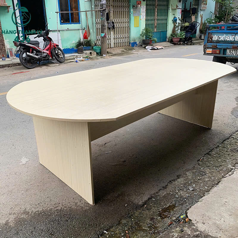Bàn Họp Oval Gỗ Cũ 2M4x1M2 Có 2 Chân Màu Kem Hiện Đại