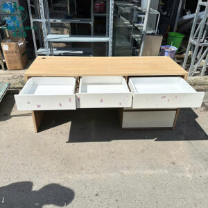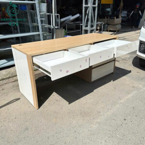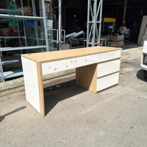 - Mô tả: Bàn làm việc cũ được làm từ gỗ dễ lau chùi và bền màu theo thời gian. Thiết kế rộng rãi, có 3 hộc kéo lớn nhỏ giúp người dùng dễ dàng phân loại và cất giữ tài liệu, vật dụng văn phòng. Tông màu trắng phối vân gỗ sáng mang lại vẻ hiện đại, phù hợp cho không gian làm việc tại nhà, công ty hay phòng học cá nhân. Kết cấu bàn chắc chắn, chịu lực tốt, bề mặt trơn mịn giúp thoải mái khi sử dụng lâu dài.