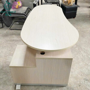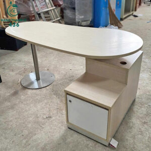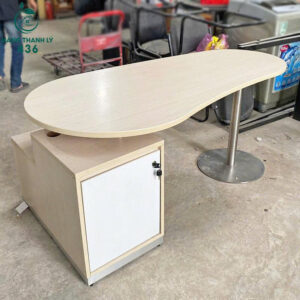 - Mô tả: Mặt bàn được thiết kế hình oval độc đáo, làm từ gỗ công nghiệp cao cấp với vân gỗ sáng, tạo cảm giác rộng rãi và thoải mái. Sản phẩm nổi bật với chân trụ kim loại vững chắc kết hợp cùng một hộc tủ liền bàn tiện lợi, cung cấp không gian lý tưởng để lưu trữ hồ sơ và vật dụng cá nhân một cách ngăn nắp.
