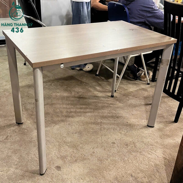 - Mô tả: Bàn làm việc cũ có thiết kế đơn giản, hiện đại với mặt bàn hình chữ nhật làm từ gỗ vân gỗ sáng màu, tạo cảm giác trang nhã và dễ lau chùi. Bốn chân bàn bằng kim loại trụ tròn sơn màu bạc, chắc chắn và có đệm cao su ở chân giúp chống trượt, bảo vệ sàn. Bàn phù hợp sử dụng trong văn phòng, phòng học hoặc không gian làm việc tại nhà. Mặt bàn vẫn còn mới dù đã qua sử dụng nhưng vẫn giữ được độ phẳng và ổn định.
