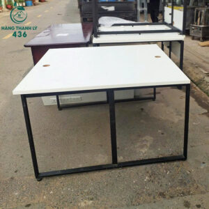 - Mô tả: Mẫu bàn làm việc cũ này có thiết kế tối giản, phù hợp với không gian văn phòng hoặc góc làm việc tại nhà. Mặt bàn làm từ gỗ công nghiệp màu trắng, trơn sạch, dễ lau chùi. Trên mặt có sẵn 2 lỗ đi dây, giúp sắp xếp dây điện gọn gàng, tiện cho việc bố trí máy tính, đèn bàn hoặc thiết bị văn phòng. Khung bàn bằng sắt vuông đen, chắc chắn và chống gỉ tốt. Kích thước bàn rộng rãi, thích hợp cho 1–2 người sử dụng hoặc ghép cụm làm việc.