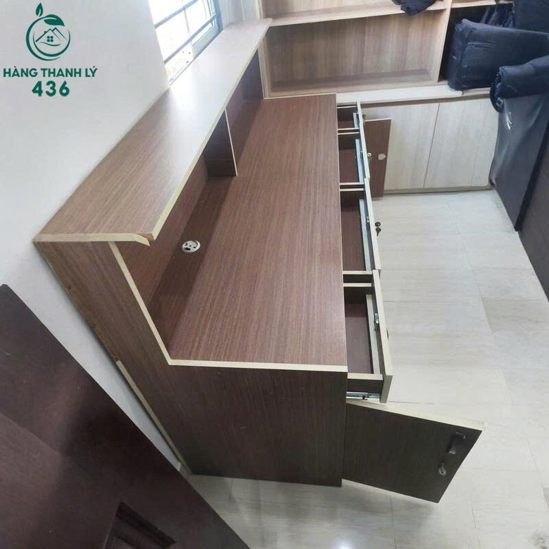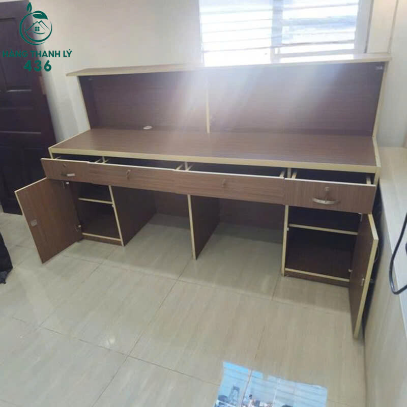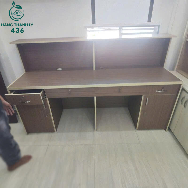 Mô tả: Mẫu bàn làm việc đôi thiết kế liền kệ phía trên, giúp tăng không gian lưu trữ hồ sơ và vật dụng cá nhân. Bàn có 2 vị trí ngồi riêng biệt, mỗi bên đi kèm hộc tủ và ngăn kéo tiện khóa, phù hợp cho văn phòng, phòng làm việc nhóm hoặc công ty nhỏ. Chất liệu gỗ công nghiệp phủ vân gỗ, màu trung tính dễ phối không gian, bàn còn sử dụng tốt và chắc chắn.