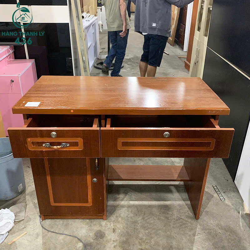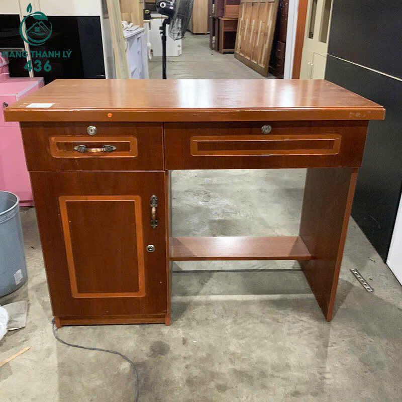 - Mô tả: Bàn làm việc cũ có thiết kế chắc chắn, màu gỗ trung tính tạo cảm giác ấm áp và chuyên nghiệp cho không gian làm việc. Mặt bàn rộng rãi, thuận tiện để bố trí máy tính, hồ sơ và các vật dụng cần thiết. Bên trái là ngăn kéo có khóa, giúp bảo quản tài liệu cá nhân an toàn. Bên phải là tủ nhỏ có cửa đóng kín, cũng được trang bị khóa riêng, tăng tính bảo mật. Các chi tiết trang trí trên mặt ngăn và cánh tủ tạo điểm nhấn nhẹ nhàng, mang lại vẻ thanh lịch cho tổng thể.