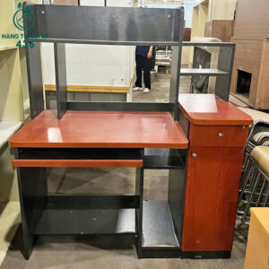 - Mô tả: Chiếc bàn máy tính cũ này được thiết kế hiện đại, đáp ứng tốt nhu cầu làm việc và học tập tại nhà hoặc văn phòng. Mặt bàn rộng rãi, bề mặt gỗ công nghiệp phủ màu đỏ nâu sang trọng, dễ lau chùi. Bàn có kệ trên để đặt sách, tài liệu hoặc các vật dụng nhỏ, giúp không gian luôn gọn gàng. Phía dưới có ngăn riêng cho CPU và khay bàn phím trượt tiện lợi. Bên cạnh là hộc tủ liền với ngăn kéo và ngăn cánh mở, rất phù hợp để lưu trữ giấy tờ, dụng cụ văn phòng.