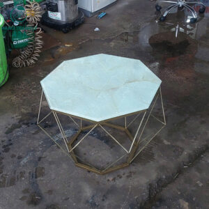 - Mô tả: Chiếc bàn trà sofa này là điểm nhấn hoàn hảo cho không gian phòng khách, sảnh chờ hoặc khu vực tiếp khách. Bàn có mặt hình đa giác độc đáo, được làm bằng vật liệu giả đá vân mây sáng màu, mang lại vẻ đẹp tinh tế, hiện đại và dễ dàng lau chùi. Phần chân bàn là khung sắt nghệ thuật được gia công tỉ mỉ, sơn/mạ màu vàng đồng lấp lánh, tạo nên một tổng thể hình học ấn tượng và vô cùng vững chắc. Sản phẩm mang phong cách thiết kế Bắc Âu, rất được ưa chuộng, giúp không gian của bạn trở nên thời thượng và đẳng cấp hơn.