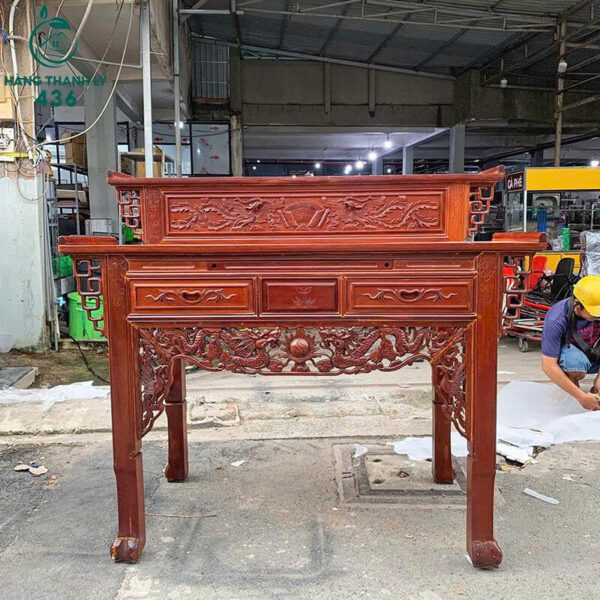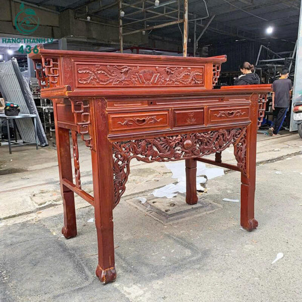 - Mô tả: Tủ thờ cũ được làm từ gỗ tự nhiên chắc chắn, phủ lớp sơn bóng mịn giúp giữ màu lâu và chống mối mọt hiệu quả. Sản phẩm nổi bật với hoa văn rồng phụng, tứ linh được chạm khắc thủ công tinh xảo, mang ý nghĩa phong thủy và sự trang nghiêm cho không gian thờ cúng. Mặt tủ rộng rãi, chia tầng tiện lợi, có ngăn kéo nhỏ để lưu trữ đồ cúng. Kiểu dáng vững chãi, cân đối, phù hợp cho gia đình yêu thích phong cách cổ điển. Hàng thanh lý còn rất đẹp, gỗ dày nặng, bền chắc theo thời gian.