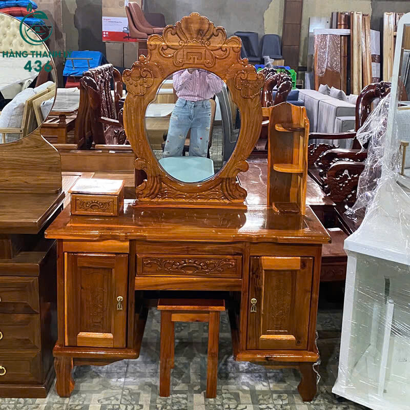 Mô tả: Bàn trang điểm gỗ thiết kế cổ điển, gương lớn hình ovan giúp thao tác trang điểm dễ dàng hơn. Các đường chạm khắc tinh xảo tạo điểm nhấn sang trọng, phù hợp phòng ngủ gia đình hoặc homestay muốn tạo nét ấm cúng. Bàn có nhiều ngăn tủ hai bên và hộc kéo ở giữa để đựng mỹ phẩm, phụ kiện rất gọn gàng. Đi kèm ghế nhỏ đồng bộ, chất gỗ chắc chắn, bề mặt còn đẹp, sử dụng lâu dài. Sản phẩm phù hợp khách cần bàn phấn bền – rẻ mà vẫn giữ được thẩm mỹ tốt.