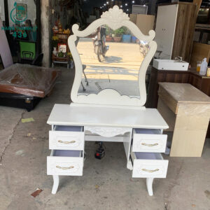 Mô tả: Bàn trang điểm với 4 ngăn kéo rộng rãi, thích hợp để cất giữ đồ trang điểm và các vật dụng cá nhân. Chất liệu gỗ chắc chắn, có lớp sơn màu trắng sáng bóng, tạo nên vẻ đẹp tinh tế, hiện đại cho không gian phòng ngủ. Gương bàn trang điểm có kích thước lớn giúp người sử dụng dễ dàng trang điểm. Thiết kế gọn gàng, giúp tiết kiệm không gian nhưng vẫn đầy đủ công năng. Sản phẩm còn mới khoảng 90%, sử dụng ổn định lâu dài, là sự lựa chọn tuyệt vời cho không gian phòng ngủ sang trọng.