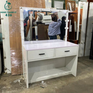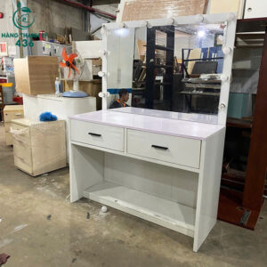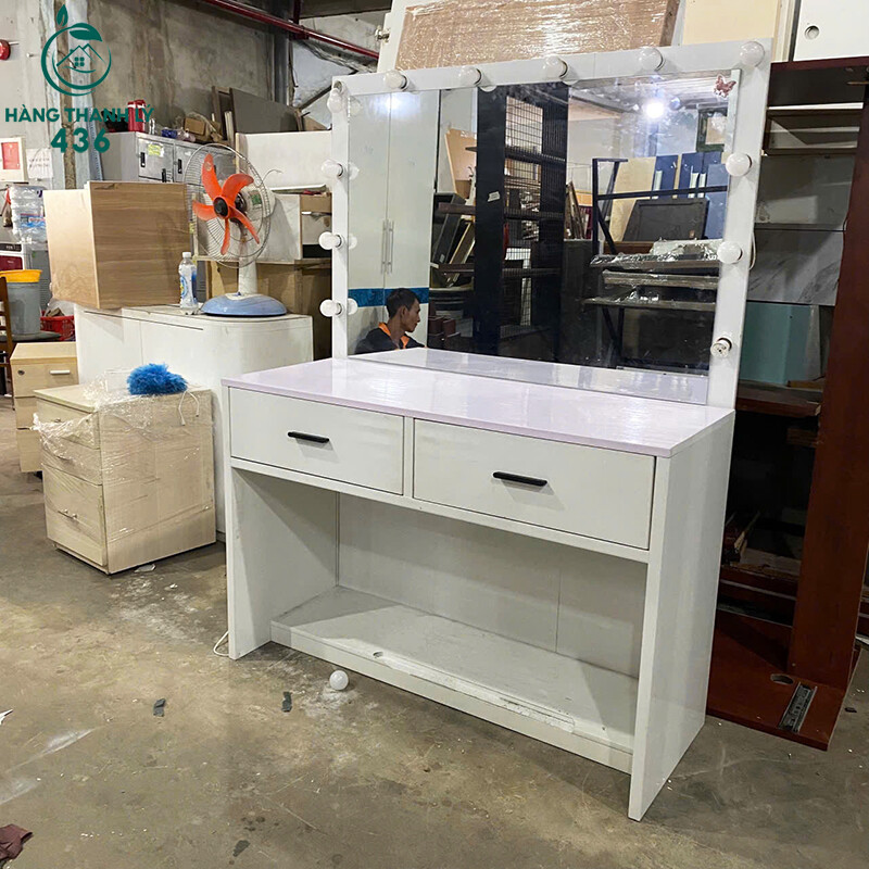 Mô tả: Mẫu bàn trang điểm này là lựa chọn tuyệt vời cho các chị em phụ nữ hoặc các tiệm makeup chuyên nghiệp cần một không gian làm đẹp chỉn chu. Với kích thước ngang 1m2 và cao 1m6, sản phẩm mang lại diện tích mặt bàn rộng rãi để bạn thoải mái bày trí mỹ phẩm và dụng cụ trang điểm. Điểm nổi bật nhất chính là hệ thống đèn LED bao quanh gương lớn, cung cấp nguồn sáng hoàn hảo giúp việc trang điểm trở nên chuẩn xác và dễ dàng hơn. Bàn được thiết kế với 2 ngăn kéo lớn có tay cầm chắc chắn, giúp lưu trữ đồ dùng cá nhân gọn gàng và kín đáo. Dù là hàng cũ nhưng khung bàn rất vững chãi, lớp sơn trắng còn sáng bóng, mang lại vẻ đẹp tinh tế cho căn phòng.