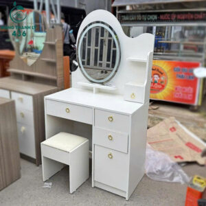 - Mô tả: Bàn trang điểm có màu trắng, mang lại vẻ đẹp tinh tế và sáng sủa cho không gian phòng ngủ. Điểm nhấn là chiếc gương hình oval lớn, tích hợp đèn LED xung quanh, tạo ánh sáng lý tưởng để trang điểm. Phần bàn được trang bị một ngăn kéo lớn và ba ngăn kéo nhỏ hơn ở bên phải, cùng với các kệ mở và một hộc tủ nhỏ phía trên, tối ưu hóa không gian lưu trữ mỹ phẩm và vật dụng cá nhân. Kèm theo là một chiếc ghế đẩu bọc đệm êm ái, tạo sự thoải mái khi sử dụng.