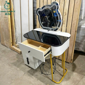 - Mô tả: Bàn trang điểm với mặt kính đen sang trọng, kết hợp với gương hình gấu dễ thương tạo điểm nhấn cho không gian. Thiết kế hiện đại, nhỏ gọn và tiện dụng, bàn trang điểm này không chỉ là món đồ trang trí mà còn là nơi lưu trữ mỹ phẩm và đồ dùng cá nhân với các ngăn kéo tiện lợi. Chân bàn được làm bằng kim loại mạ vàng bền bỉ, mang đến sự chắc chắn và vẻ ngoài sang trọng. Đây là lựa chọn lý tưởng cho các không gian phòng ngủ hiện đại.