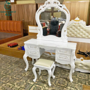 - Mô tả: Bàn trang điểm phong cách tân cổ điển với thiết kế tinh tế, màu trắng nổi bật, phù hợp với không gian phòng ngủ sang trọng. Gương lớn khung hoa văn uốn lượn và tiện lợi khi sử dụng. Bàn đi kèm 4 ngăn kéo nhỏ giúp sắp xếp mỹ phẩm, phụ kiện gọn gàng. Ghế ngồi đệm da êm ái, chân bàn và ghế được chạm khắc tỉ mỉ, tạo điểm nhấn ấn tượng. Sản phẩm có bề mặt nhẵn bóng, dễ lau chùi, thích hợp cho gia đình muốn nâng cấp nội thất mà không cần đầu tư quá nhiều chi phí.