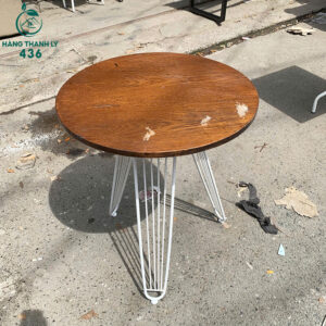 - Mô tả: Bàn tròn gỗ cũ có mặt bàn bằng gỗ tự nhiên màu nâu, chân thép sơn tĩnh điện chắc chắn, phù hợp để làm bàn uống nước hoặc bàn trang trí trong phòng khách. Mặt bàn tròn rộng rãi, dễ dàng lau chùi, mặc dù có vài vết trầy xước nhẹ nhưng vẫn giữ được vẻ đẹp sang trọng, thích hợp với các không gian hiện đại hoặc cổ điển. Chân bàn thép vững vàng, ít bị rung lắc. Đây là lựa chọn tuyệt vời cho những ai yêu thích sự đơn giản nhưng vẫn cần một sản phẩm bền lâu, dễ dàng kết hợp với các đồ nội thất khác.