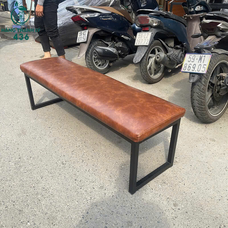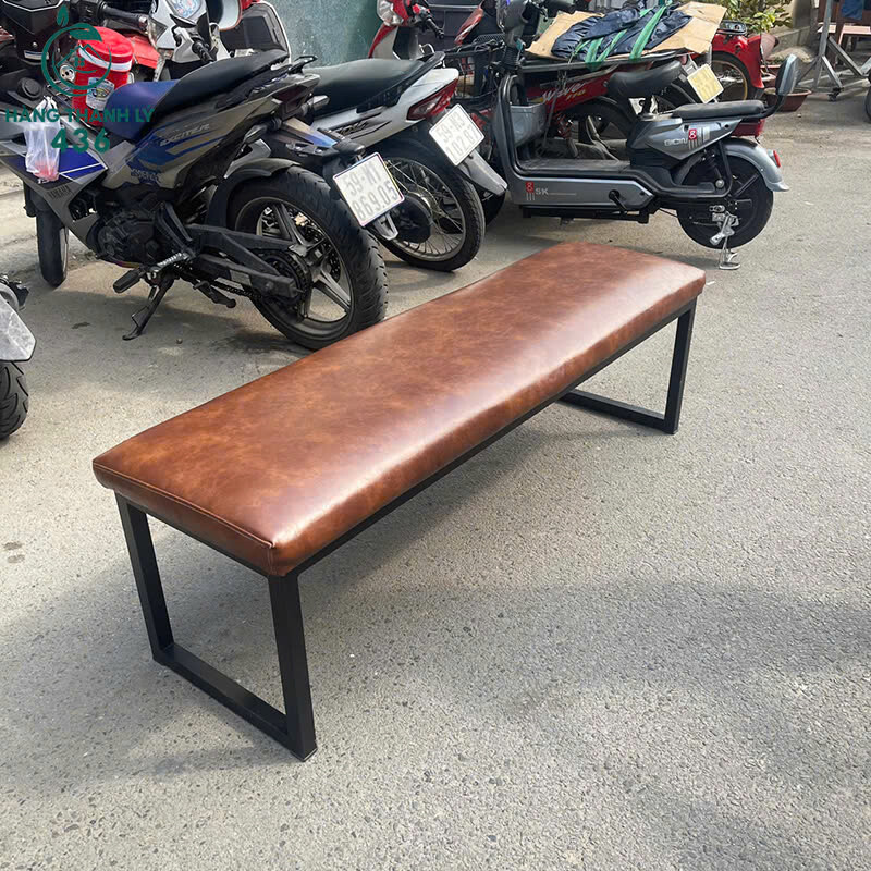 Mô tả: Băng ghế dài thiết kế đơn giản, phần mặt ngồi bọc da màu nâu sang trọng, dễ lau chùi và sử dụng hằng ngày. Khung chân sắt sơn đen chắc chắn, chịu lực tốt, dáng thấp vững vàng khi ngồi. Kiểu ghế không tựa phù hợp kê cuối giường, phòng chờ, quán cafe, spa hoặc khu vực tiếp khách.