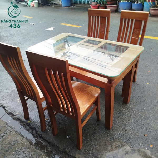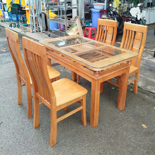 - Mô tả: Bộ bàn ăn cũ gồm 1 bàn và 4 ghế, thiết kế đơn giản, tinh tế, phù hợp cho gia đình nhỏ hoặc căn hộ chung cư. Bàn làm từ gỗ chắc chắn, phủ lớp sơn bóng mịn dễ lau chùi. Mặt bàn được lót kính dày, vừa sang trọng vừa tiện vệ sinh. Ghế có tựa lưng cong nhẹ, tạo cảm giác thoải mái khi ngồi lâu. Tình trạng hàng còn mới khoảng 90%, không mối mọt, khung gỗ chắc chắn, màu gỗ sáng dễ phối với nhiều phong cách nội thất.