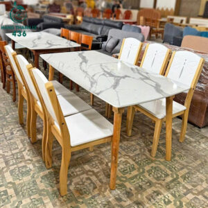 - Mô tả: Bộ bàn ăn gồm bàn mặt đá hình chữ nhật và 6 ghế gỗ lưng tựa cong nhẹ, thiết kế cân đối và chắc chắn. Mặt vân đá mây trắng nổi bật, dễ lau chùi, tạo cảm giác sạch sẽ và tinh tế. Ghế có tựa lưng cao giúp ngồi thoải mái, phù hợp sử dụng trong gia đình 4–6 người hoặc dùng cho quán ăn, quán cơm, căn hộ dịch vụ. Bàn có kích thước đủ rộng, giúp bày biện món ăn dễ dàng mà vẫn gọn gàng.