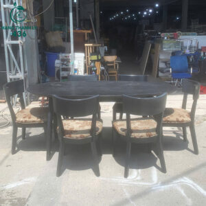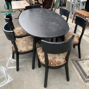 Mô tả: Bộ bàn ăn cũ với thiết kế mặt bàn gỗ đen chắc chắn và 6 ghế bọc vải hoa đẹp mắt, tạo điểm nhấn cho không gian ăn uống. Ghế được trang bị đệm mút êm ái, giúp tạo sự thoải mái trong bữa ăn. Bàn ăn oval rộng rãi, phù hợp cho các gia đình có không gian bếp hoặc phòng ăn nhỏ. Đây là lựa chọn tiết kiệm nhưng vẫn đảm bảo tính thẩm mỹ và độ bền cao.