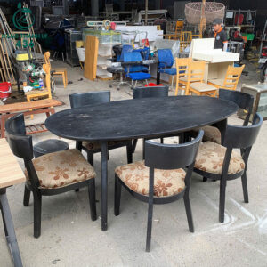 Mô tả: Bộ bàn ăn cũ với thiết kế mặt bàn gỗ đen chắc chắn và 6 ghế bọc vải hoa đẹp mắt, tạo điểm nhấn cho không gian ăn uống. Ghế được trang bị đệm mút êm ái, giúp tạo sự thoải mái trong bữa ăn. Bàn ăn oval rộng rãi, phù hợp cho các gia đình có không gian bếp hoặc phòng ăn nhỏ. Đây là lựa chọn tiết kiệm nhưng vẫn đảm bảo tính thẩm mỹ và độ bền cao.