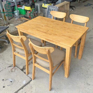 - Mô tả: Bộ bàn ăn cũ 4 ghế được làm từ gỗ chắc chắn, mang lại sự bền bỉ và tính thẩm mỹ cao. Mặt bàn hình chữ nhật đơn giản, dễ dàng lau chùi, kết hợp cùng 4 ghế ngồi có tựa lưng cong nhẹ tạo sự thoải mái khi sử dụng. Gam màu gỗ sáng tự nhiên giúp bộ bàn ghế dễ dàng hòa hợp với nhiều phong cách nội thất khác nhau, từ phòng ăn gia đình nhỏ đến quán ăn, quán cà phê. Với thiết kế gọn gàng, sản phẩm tiết kiệm diện tích nhưng vẫn đảm bảo không gian ăn uống tiện nghi.