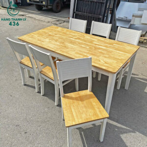 - Mô tả: Bộ bàn ăn cũ 6 ghế với thiết kế đơn giản, hiện đại, thích hợp cho không gian phòng ăn hoặc phòng bếp. Mặt bàn được làm từ gỗ bền bỉ, kết hợp với khung bàn và ghế sơn trắng tạo nên vẻ đẹp thanh lịch, sang trọng. Ghế được thiết kế thoải mái, với lưng ghế và đệm ngồi bằng gỗ chắc chắn, phù hợp cho các bữa ăn gia đình. Bộ bàn ghế này không chỉ đẹp mà còn rất bền và dễ dàng vệ sinh, mang lại sự tiện dụng cho không gian sống của bạn.
