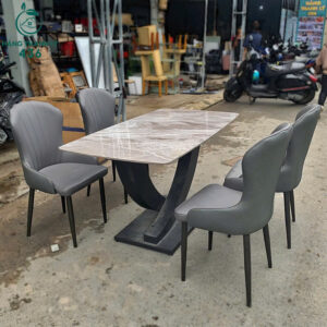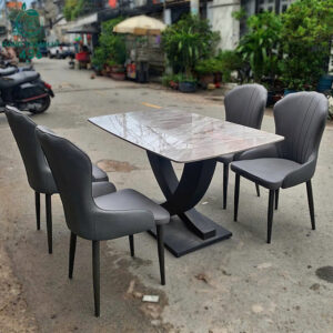 - Mô tả: Bộ bàn ăn cũ gồm 1 bàn mặt đá và 4 ghế bọc nệm, phù hợp cho gia đình đông người hoặc không gian phòng ăn sang trọng. Mặt bàn đá bóng đẹp, dễ vệ sinh và chống thấm tốt. Chân bàn hình trụ vuông chắc chắn, mang lại cảm giác vững chãi khi sử dụng. Ghế ngồi có tựa lưng cao, bọc da màu xám nhạt, đệm ngồi dày tạo sự êm ái. Kiểu dáng hiện đại, tông màu trung tính dễ phối nội thất.