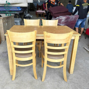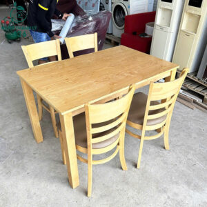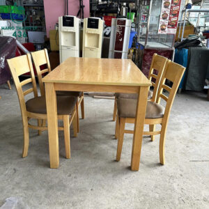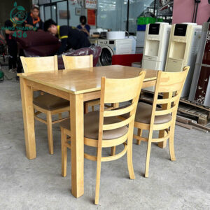 - Mô tả: Bộ bàn ăn cũ gồm 1 bàn chữ nhật và 4 ghế gỗ, bề mặt sơn phủ bóng nhẹ giúp dễ lau chùi. Ghế có đệm ngồi bọc da nâu mềm, mang lại cảm giác thoải mái khi sử dụng lâu dài. Thiết kế kiểu dáng tối giản, phù hợp cho không gian phòng ăn gia đình, quán ăn hoặc căn hộ nhỏ. Kết cấu gỗ nguyên khối chắc chắn, không cong vênh, không lung lay. Hàng cũ còn mới trên 90%, form đẹp, màu gỗ sáng hiện đại, dễ phối nội thất.