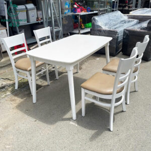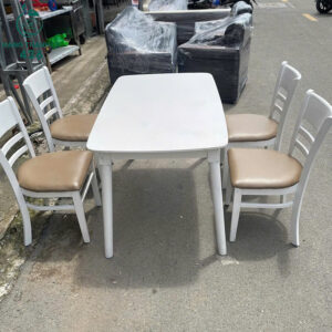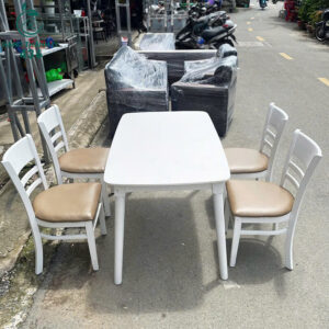 - Mô tả: Bộ bàn ăn cũ 4 ghế màu trắng thiết kế gọn gàng, phù hợp với không gian gia đình nhỏ, căn hộ chung cư hoặc nhà phố. Mặt bàn chữ nhật bo góc nhẹ, tạo cảm giác mềm mại, an toàn khi sử dụng. Ghế đi kèm có tựa lưng chắc chắn, đệm ngồi bọc da màu nâu nhạt, mang lại sự thoải mái khi ngồi lâu. Bộ bàn ghế dễ dàng kết hợp với nhiều phong cách nội thất khác nhau, từ hiện đại đến đơn giản. Chất liệu gỗ dễ lau chùi và giữ độ sáng mới lâu dài.