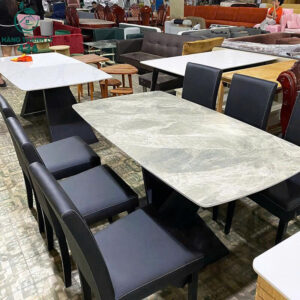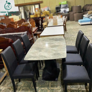 - Chất liệu: Bàn vân đá, ghế bọc da