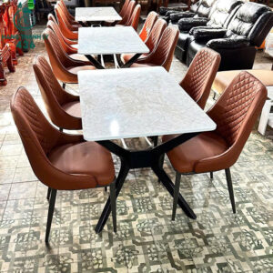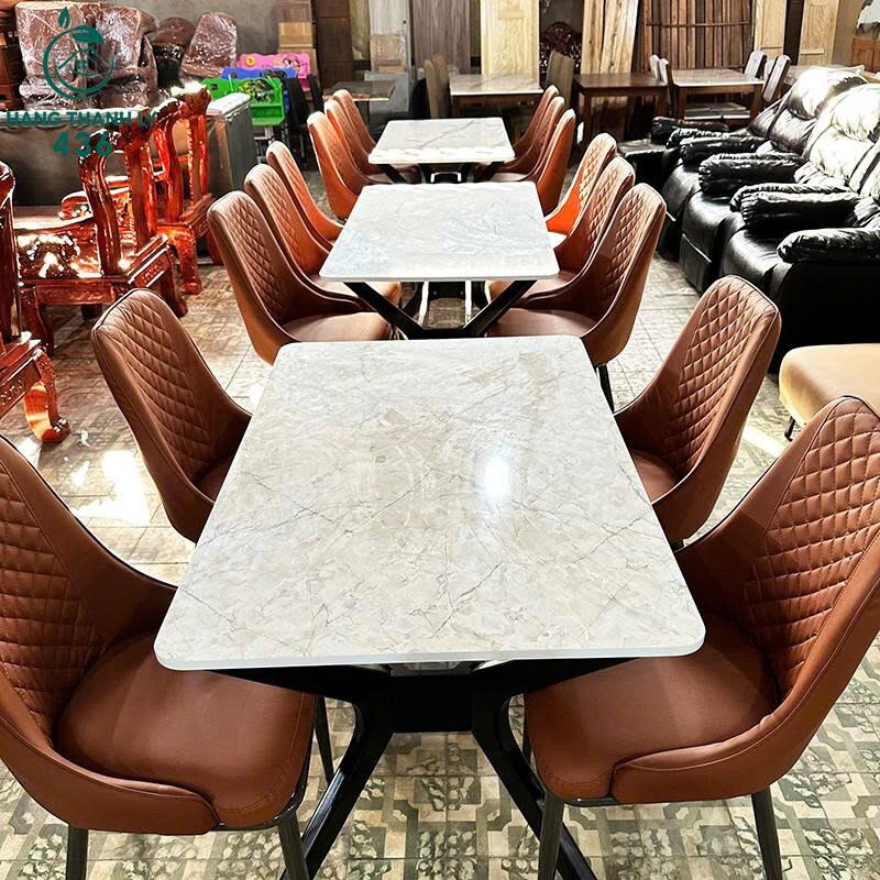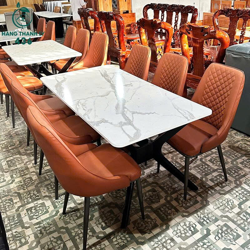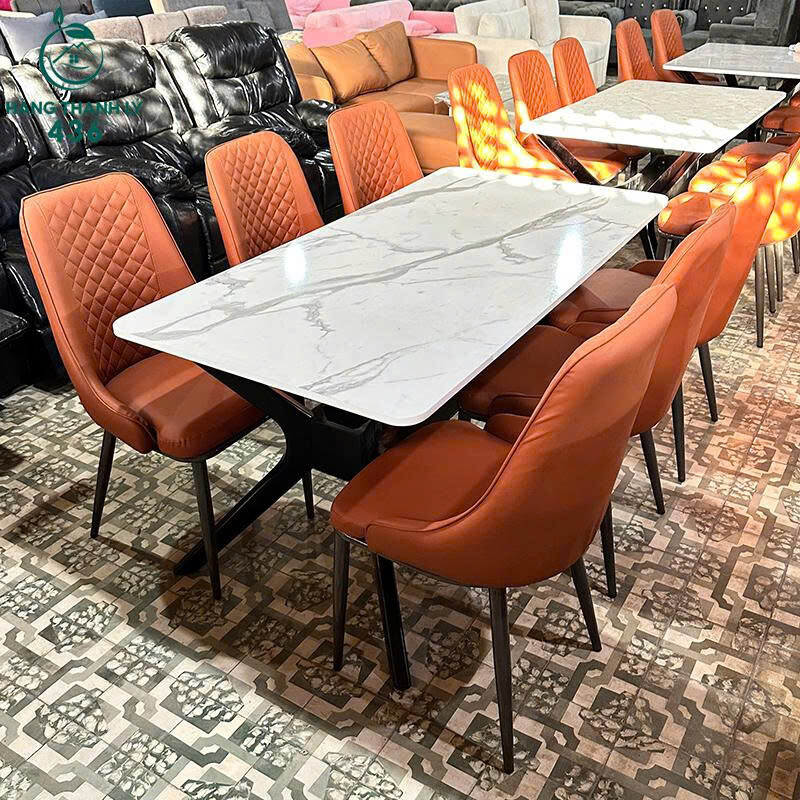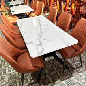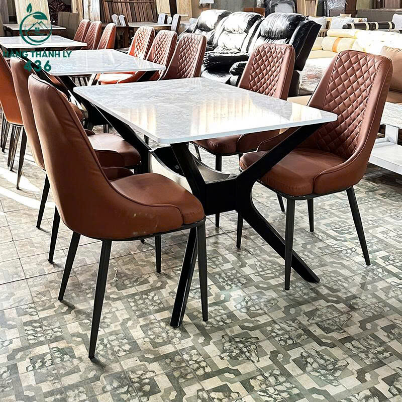 - Mô tả: Bộ bàn ăn gồm 1 bàn mặt đá vân mây trắng và 4-6 ghế bọc da nâu cao cấp, mang phong cách hiện đại, sang trọng. Mặt bàn đá nhân tạo bóng mịn, dễ vệ sinh và chịu nhiệt tốt. Chân bàn và ghế làm từ sắt sơn tĩnh điện, đảm bảo độ chắc chắn và bền bỉ theo thời gian. Ghế bọc da êm ái, tựa lưng may caro tinh tế, tạo cảm giác thoải mái khi dùng. Sản phẩm mới 99%, phù hợp cho nhà hàng, căn hộ, gia đình hoặc homestay cao cấp.