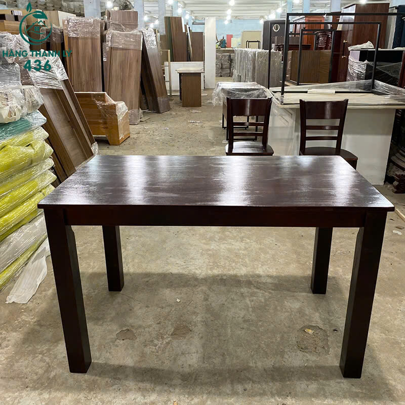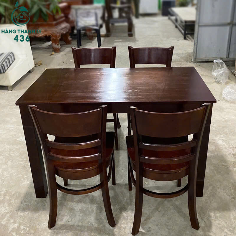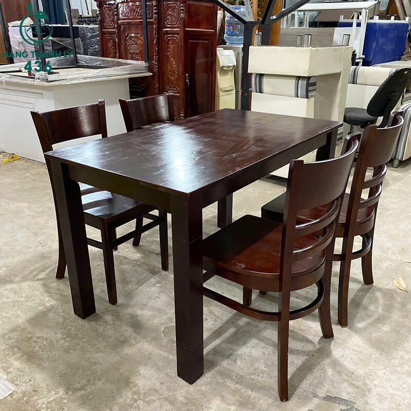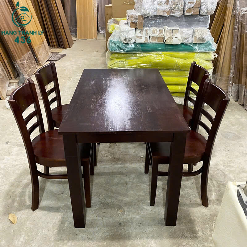 Mô tả: Bộ bàn ăn gồm 1 bàn chữ nhật và 4 ghế gỗ đồng bộ, thiết kế đơn giản, chắc chắn, phù hợp dùng cho gia đình hoặc căn hộ nhỏ. Bề mặt gỗ màu nâu sẫm, dễ lau chùi, ghế ngồi thoải mái, lưng tựa cong nhẹ. Kết cấu vững, sử dụng ổn định cho sinh hoạt hằng ngày. Thích hợp cho khách cần bộ bàn ăn gỗ giá tiết kiệm, dùng lâu dài.