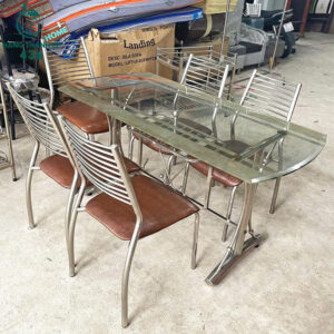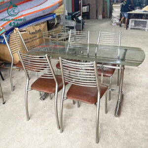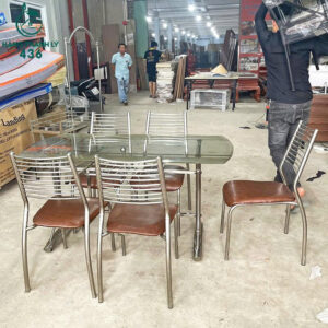 - Mô tả: Bộ bàn ăn cũ thiết kế hiện đại gồm bàn mặt kính sáng bóng kết hợp khung inox chắc chắn, đi kèm 5 ghế inox bọc nệm da màu nâu. Mặt bàn kính dễ lau chùi, hạn chế trầy xước nhẹ, mang đến sự sang trọng và thoáng đãng cho không gian phòng ăn. Ghế có tựa lưng thanh ngang tạo cảm giác thoải mái khi ngồi dùng bữa. Khung inox sáng bóng, chống gỉ sét, sử dụng lâu dài vẫn giữ được độ bền.