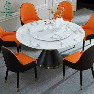 - Mô tả: Bộ bàn ăn gồm 1 bàn tròn mặt đá trắng có mâm xoay tiện lợi và 6 ghế nệm phối nâu cực kỳ nổi bật. Thiết kế hiện đại, sang trọng, phù hợp cho không gian phòng ăn căn hộ, nhà phố hoặc biệt thự. Ghế ngồi bọc da êm ái, phần chân chắc chắn, nâng tầm thẩm mỹ tổng thể. Bàn có chân trụ to tạo sự vững chãi, dễ lau chùi, thích hợp cho bữa cơm gia đình thêm ấm cúng.