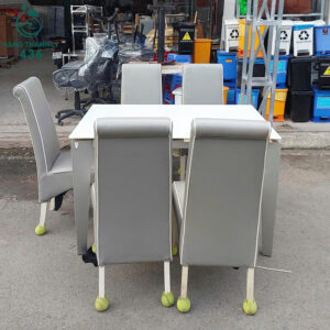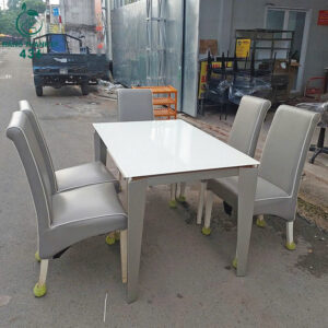 - Mô tả: Bộ bàn ăn 5 ghế cũ thiết kế hiện đại, gam màu xám kết hợp mặt bàn trắng tinh tế, mang đến vẻ sang trọng và dễ phối với mọi không gian nội thất. Ghế bọc da mềm mịn, dễ lau chùi. Khung ghế chắc chắn, đệm ngồi êm ái tạo cảm giác thoải mái khi sử dụng. Mặt bàn sáng bóng. Phù hợp cho phòng ăn gia đình, quán ăn, homestay hoặc văn phòng nhỏ. Hàng còn mới khoảng 90%, sạch đẹp, chắc chắn, sẵn sàng sử dụng ngay.
