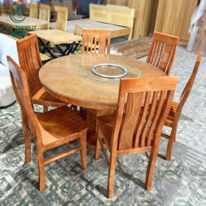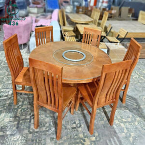 - Mô tả: Bộ bàn ăn này có thiết kế hiện đại và thanh lịch, với bàn hình tròn làm từ gỗ tự nhiên màu vàng nâu ấm áp. Mặt bàn được trang bị một tấm kính trong suốt dày dặn, có thể xoay được ở giữa, rất tiện lợi cho việc dùng bữa và chia sẻ món ăn. Chân bàn gỗ vững chắc, tạo sự ổn định cho toàn bộ kết cấu. Đi kèm là 6 chiếc ghế ăn đồng bộ, được làm từ gỗ với thiết kế tựa lưng và mặt ghế thanh thoát, mang lại sự thoải mái khi sử dụng. Đây là bộ bàn ăn lý tưởng cho không gian phòng ăn hiện đại, gia đình hoặc quán ăn, mang đến sự tiện nghi và vẻ đẹp tinh tế.