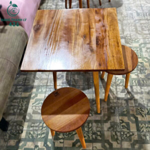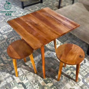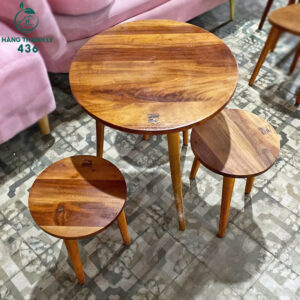 - Mô tả: Bộ bàn cafe gồm 1 bàn mặt tam giác bo tròn độc đáo và 3 ghế tròn nhỏ, phù hợp cho các quán cafe, trà sữa hoặc khu vực tiếp khách nhỏ gọn. Bề mặt gỗ láng mịn, vân đẹp tự nhiên, thiết kế tối giản giúp dễ phối đồ. Chân bàn và ghế dạng trụ thẳng, tạo sự chắc chắn và ổn định khi sử dụng. Bộ sản phẩm có thể linh hoạt di chuyển, không chiếm nhiều diện tích, thích hợp cả trong nhà lẫn ngoài trời. Màu gỗ sáng tạo cảm giác ấm cúng và gần gũi.