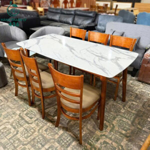 - Mô tả: Bộ bàn ăn gồm 1 bàn mặt vân đá trắng vân mây hình chữ nhật và 6 ghế gỗ có lưng tựa cong, tạo sự thoải mái khi ngồi lâu. Ghế được bọc nệm ngồi giúp êm ái, chống mỏi. Mặt bàn cứng cáp, dễ vệ sinh, không thấm nước, chống trầy nhẹ. Kiểu dáng hiện đại nhưng vẫn giữ nét cổ điển, phù hợp cho gia đình đông người, căn hộ, nhà hàng hoặc quán ăn có phong cách riêng biệt.