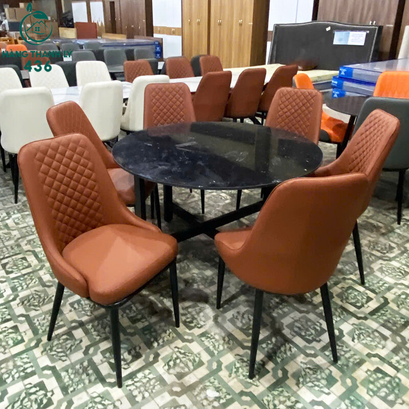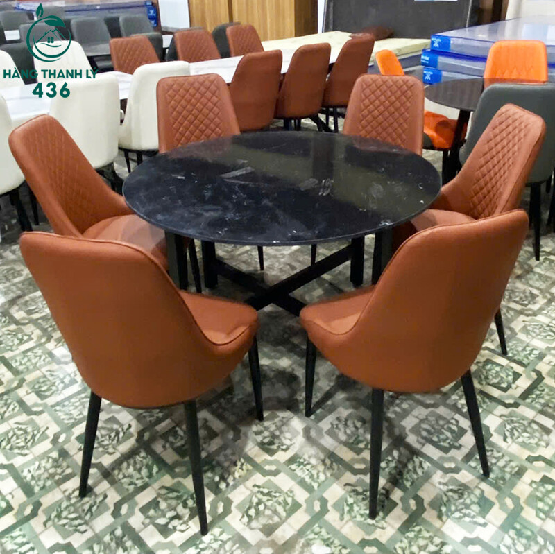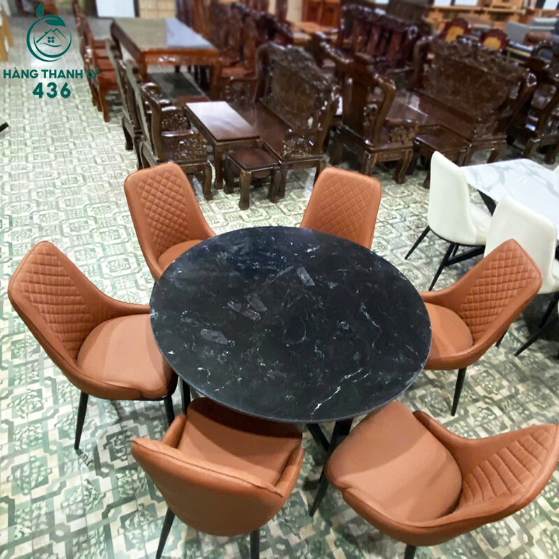 Mô tả: Bộ bàn ăn này gồm bàn tròn và 6 ghế, phù hợp sử dụng cho gia đình từ 4–6 người. Mặt đá tròn tạo cảm giác gọn gàng, dễ bố trí chỗ ngồi và thuận tiện khi dùng bữa. Ghế bọc da êm, màu sắc nổi bật, dễ phối với nhiều kiểu nội thất khác nhau. Tổng thể bộ bàn ghế ăn thanh lý đáp ứng tốt nhu cầu sử dụng hằng ngày mà vẫn giúp tiết kiệm chi phí.