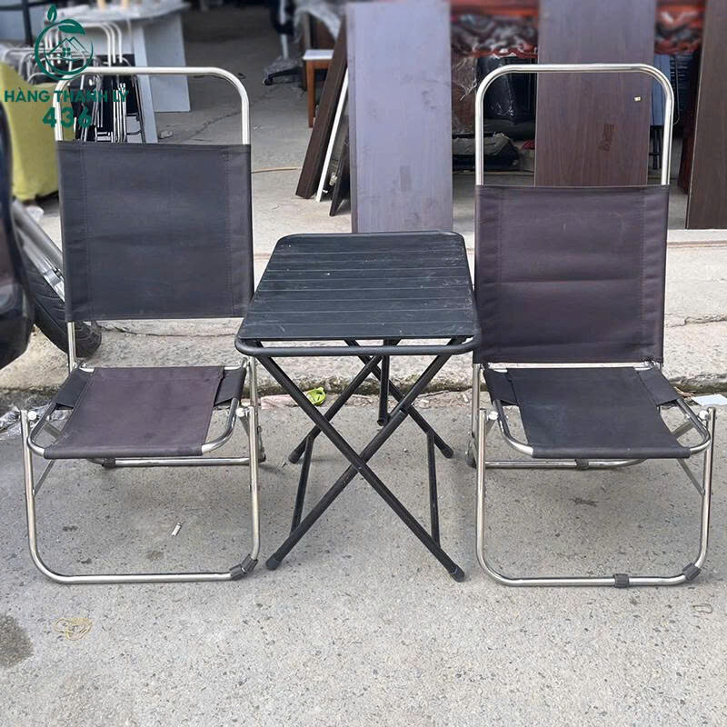 - Mô tả: Bộ bàn ghế này là sự lựa chọn hoàn hảo cho những ai yêu thích sự tiện lợi và linh hoạt, được thiết kế với khung kim loại chắc chắn và mặt bàn, mặt ghế bằng vải bố màu đen bền bỉ. Bàn có thể gấp lại gọn gàng, tiết kiệm không gian. Hai chiếc ghế đi kèm có thiết kế đơn giản, nhẹ nhàng nhưng vẫn đảm bảo sự thoải mái.
