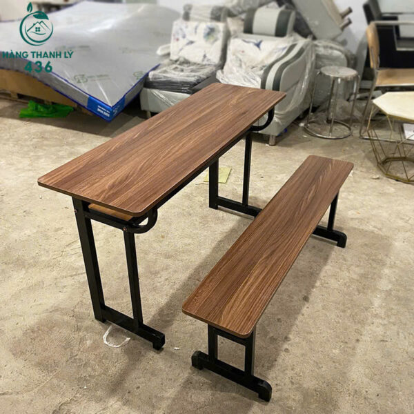 - Mô tả: Bộ bàn ghế học sinh cũ được thiết kế liền ghế, khung sắt sơn tĩnh điện màu đen chắc chắn, không rung lắc. Mặt bàn và ghế làm từ ván vân nâu sang trọng, dễ lau chùi, đảm bảo độ bền cao. Kiểu dáng gọn gàng, phù hợp cho lớp học, trung tâm đào tạo, quán cafe học tập hoặc sử dụng tại nhà. Hàng cũ còn mới khoảng 90%, đã được vệ sinh sạch, sẵn sử dụng ngay. Kích thước tiêu chuẩn cho 2 người ngồi thoải mái, giá thanh lý cực rẻ so với hàng mới.