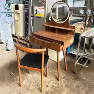 - Mô tả: Bàn trang điểm cũ làm từ gỗ, màu nâu sậm sang trọng, mang phong cách Bắc Âu hiện đại. Thiết kế gồm gương tròn cố định, ngăn kéo trượt nhẹ và kệ nhỏ trên mặt bàn, giúp sắp xếp mỹ phẩm, phụ kiện gọn gàng. Đi kèm ghế gỗ nệm bọc simili đen tạo cảm giác êm ái khi sử dụng. Bàn nhỏ gọn, phù hợp với phòng ngủ, homestay hoặc căn hộ mini, vừa làm bàn trang điểm vừa có thể dùng làm bàn làm việc. Hàng còn mới khoảng 90%, bề mặt sáng bóng, chân bàn chắc chắn, không cong vênh.