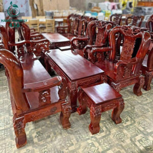 - Mô tả: Bộ salon gỗ thiết kế tay bo tròn dày dặn, bề mặt ghế và bàn đều liền nguyên tấm, vân gỗ đều màu, bóng mịn. Phần lưng tựa chạm tròn sắc nét, cân đối và nổi khối tạo cảm giác sang trọng. Chân ghế, bàn chạm hoa văn mềm mại đồng bộ, kiểu dáng chuẩn salon gỗ cổ điển truyền thống. Bộ ghế thích hợp đặt ở phòng khách nhà phố, văn phòng tiếp khách yêu thích chất gỗ xưa bền đẹp.