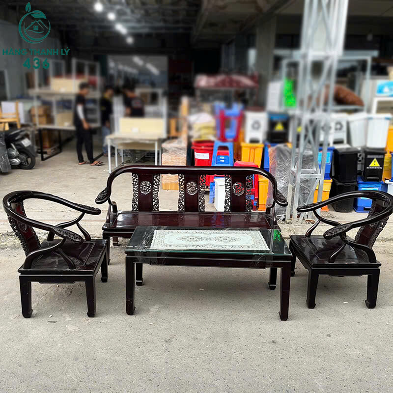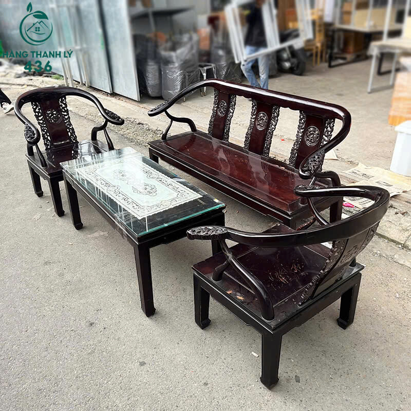 Bộ Salon Gỗ Tự Nhiên Cũ Mặt Kính Chạm Hoa Văn Sang Trọng